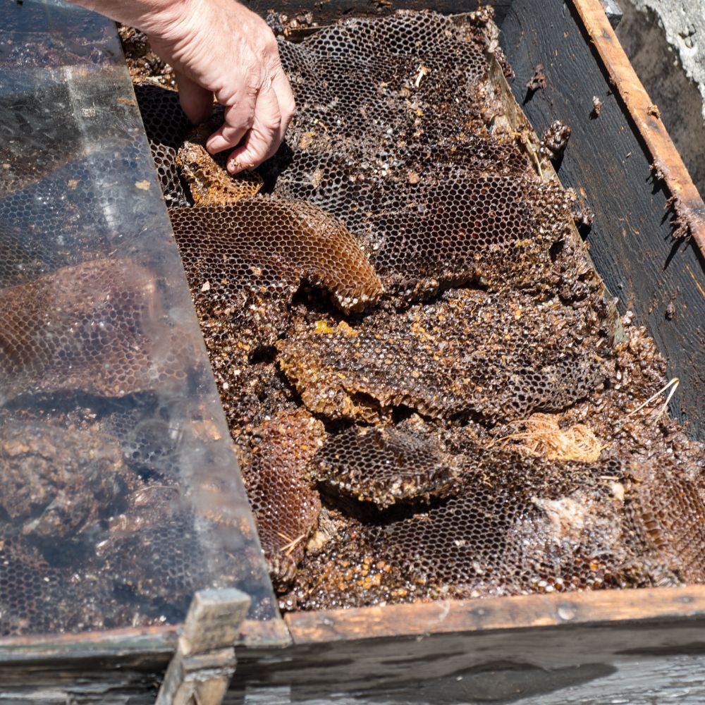 Kerätty villirakenne viedään huolellisesti talteen ja sulatusta odottamaan. Tämä ei ole mitä tahansa mehiläisvahaa. Tämä on rakkaudella mehiläisiltä saatua arvotavaraa.