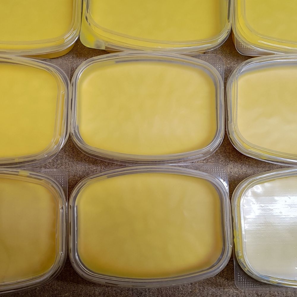 Puhdistuksen jälkeen vaha sulatetaan vielä uudelleen. Jokainen kierros parantaa puhtautta, mutta käsittelyä ei viedä pidemmälle kuin on tarpeen. Vahaa ei valkaista eikä ylipuhdisteta – ei siksi, ettei voisi, vaan siksi ettei ole syytä.