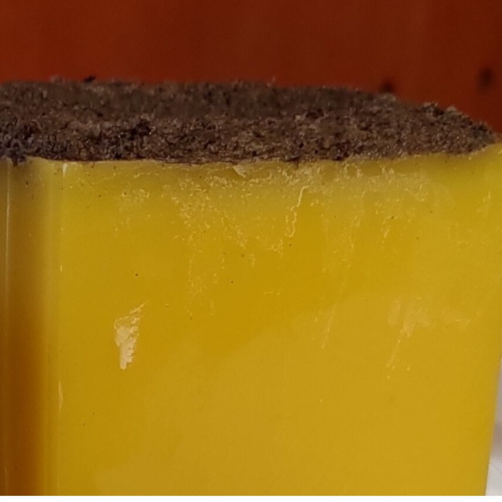 Tuloksena on vaha–roskamössö, jossa kaikki on vielä sekaisin. Se on sotkuista ja raskasta käsitellä. Vasta jähmettyessään massa alkaa paljastaa keltaista sävyään – merkkiä siitä, että vaha on siellä, kaiken muun joukossa.
