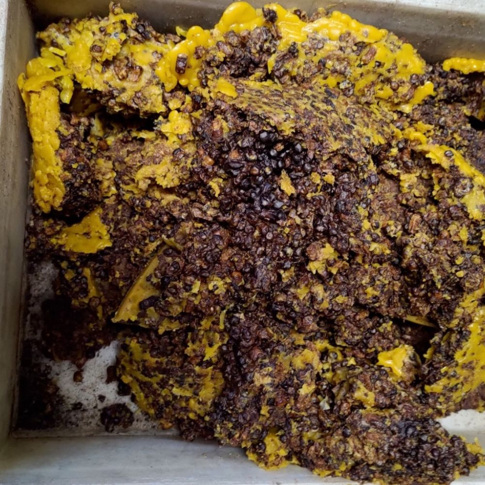 Tässä massassa on mukana koko pesän elämä: jonkin verran kennoihin luonnollisesti kuolleita mehiläisiä ja toukkia, toukkien koteloita, siitepölyhiukkasia ja mehiläisten kakkaa. Tämä ei ole virhe prosessissa eikä poikkeus, vaan luonnollinen lähtökohta, josta mehiläisvaha alkaa.