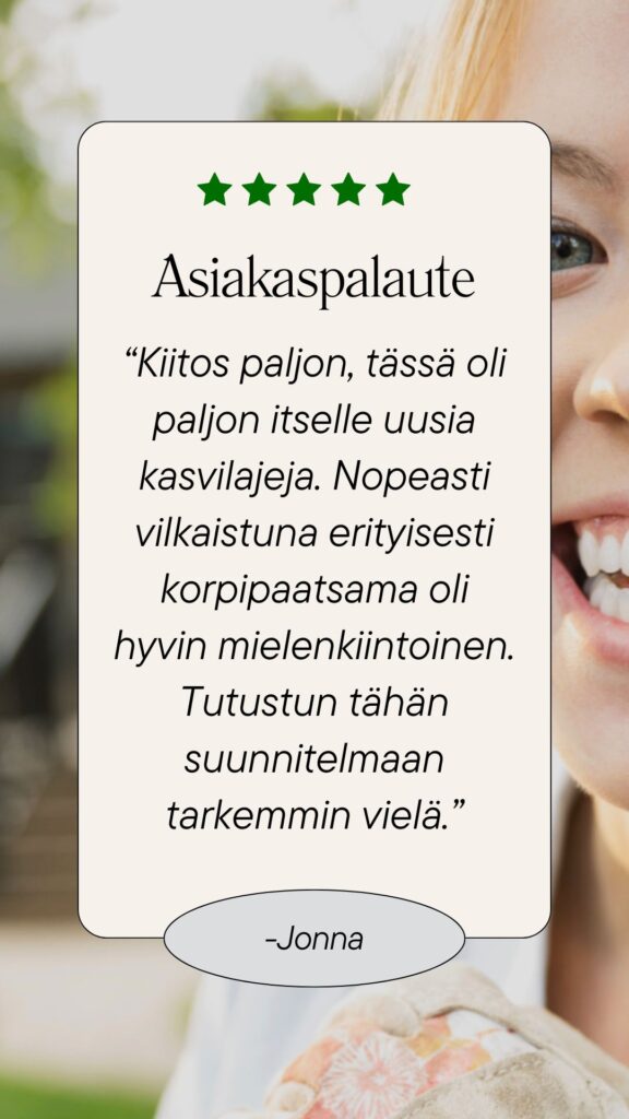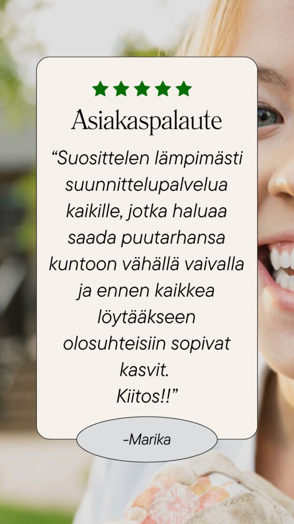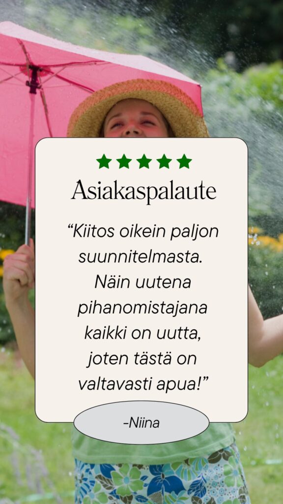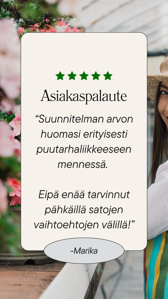 “Suunnitelma ylitti odotukset. Nyt ei tarvitse pähkäillä taimimyymälässä – tiedän täsmälleen, mitä ostaa.”