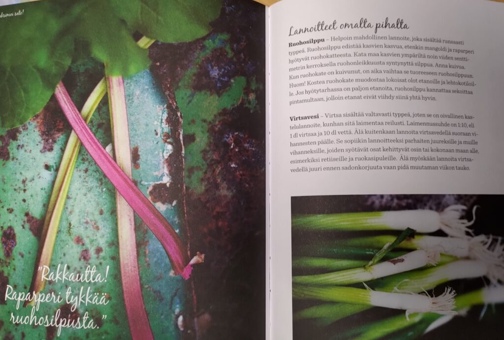Maanparannus ja -hoito saavat kirjassa myös paljon tilaa, mikä on mainio juttu. Viljelykierto opastetaan selkeästi ja mukana on myös hyviä ohjeita kotitekoisiin lannoitteisiin.