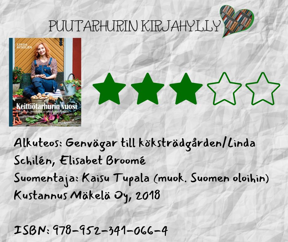 Keittiötarhurin vuosi kirja on ruotsalaisen puutarhurin ja ”tv-kasvon” Linda Schilénin kirjoittama. Sen ohjeet on kääntäessä muokattu myös Suomeen sopivaksi. Ruotsi ja Suomi nyt eivät kauheasti ilmastollisesti toisistaan eroakaan.