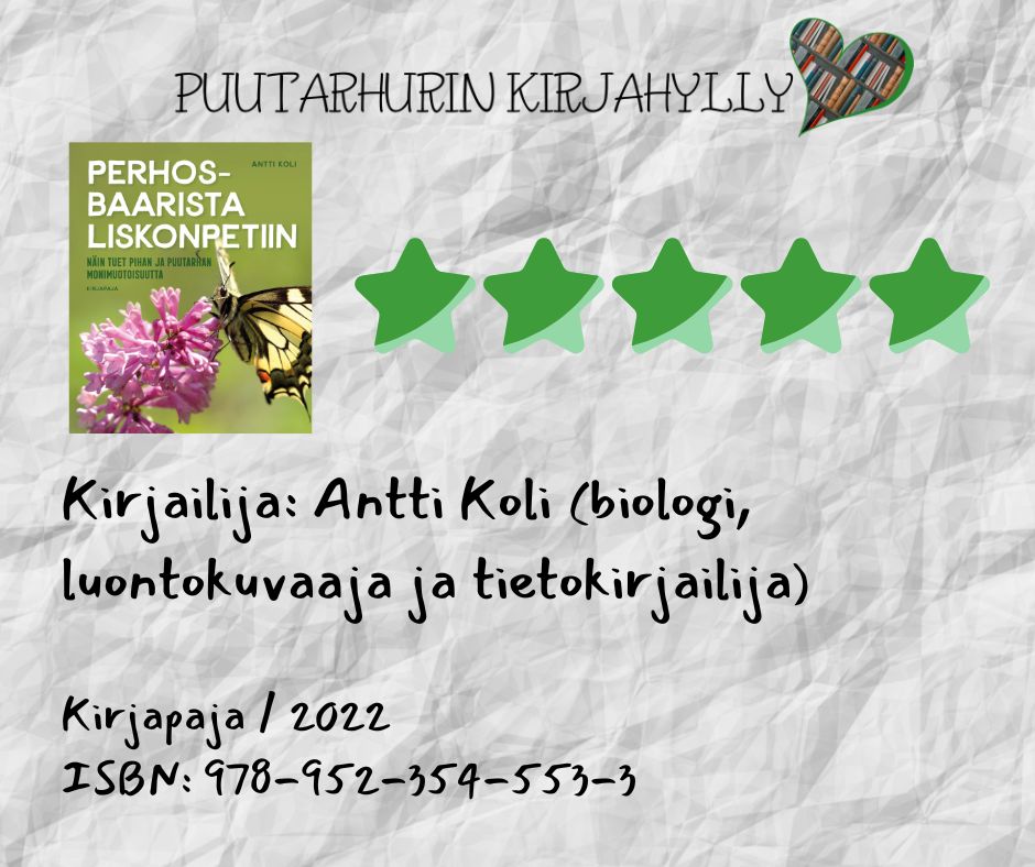Suosittelen kirjaa jokaiselle, joka haluaa lisää monimuotoisuutta puutarhaan ja kaipaa siihen käytännönläheisiä vinkkejä ja ohjeita. Vinkkejä ja uutta tietoa siitä löytyy tällaiselle vähän kokeneemmallekin puutarhan hoitajalle.