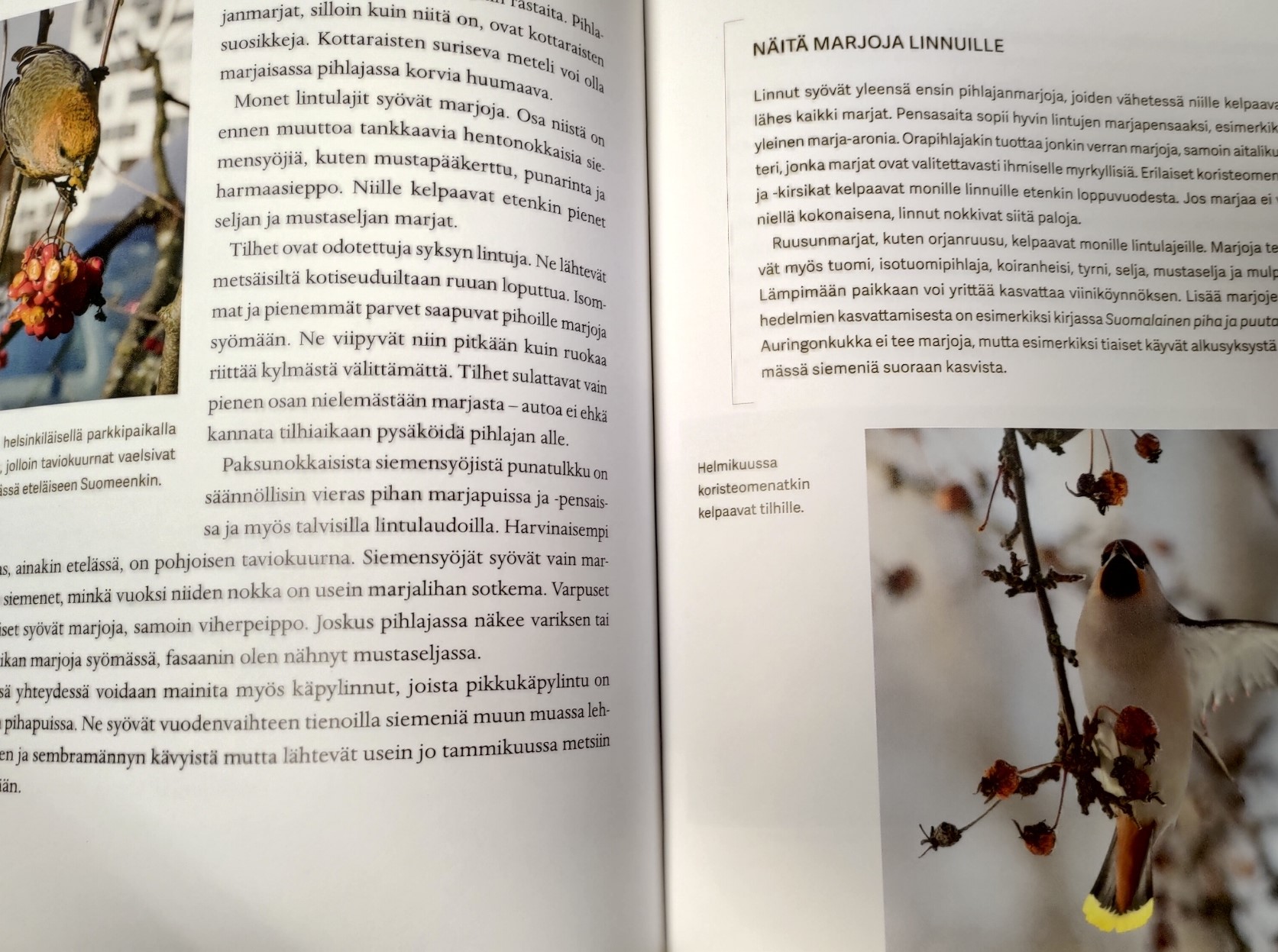 Linnuista marjoja syövät rastaat ovat välillä vähän vähemmän tervetulleita pihavieraita. Niiden luontoystävälliseen karkoitukseen löytyy kirjasta myös ohjeita.