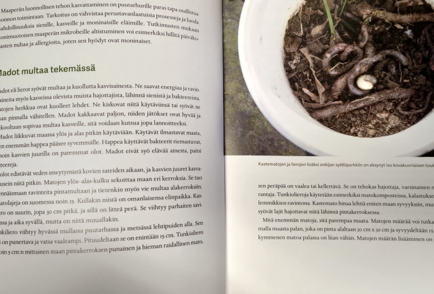 Tiesitkö muuten, että Pohjois-Amerikassa madot kuolivat viime jääkauden aikana sukupuuttoon? (Minä en tiennyt!) Matoja ei enää ollut ja kuolleet kasvinosat jäivätkin maahan. Vuosituhansien aikana ekosysteemi sopeutui tähän, kunnes 1500-luvulla ihmiset toivat madot mukanaan. Nyt niistä on tullut paikoin haittalajeja, jotka syrjäyttävät esimerkiksi tuhat- ja satajalkaiset ja muut lehtien maan pinnassa tuhoajat.