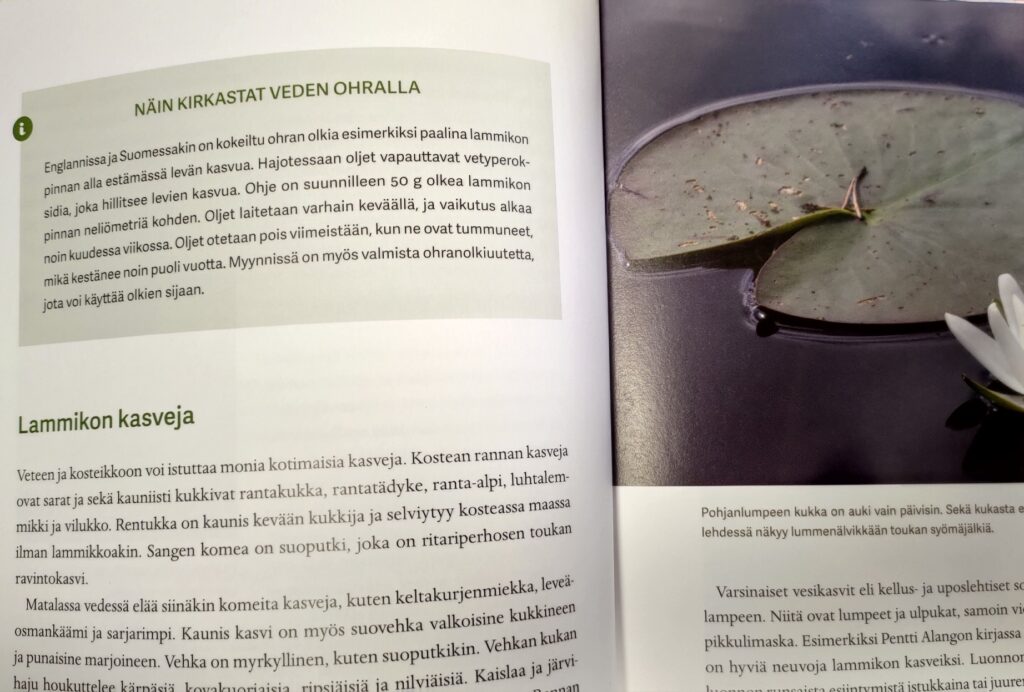 Kirjasta löytyy ohjeita paitsi erilaisten vesiaiheiden rakentamiseen, myös niiden hoitoon luonnonmukaisesti. Pihalampeen ei toki voi mitään puhdistuskemikaaleja käyttää!
