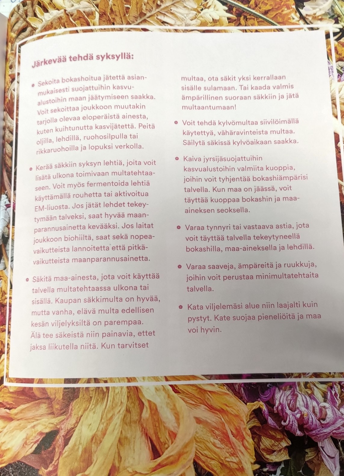 Tykkään itse erityisesti eri vuodenajoille annetuista selkeistä ohjeista. Monissa bokashointiohjeissa vuodenaikojen vaikutukset bokashointiin ohitetaan tyystin, mutta ei tässä kirjassa! Vaihtoehtoja löytyy useampia, mikäli haluat bokashoida ympäri vuoden.