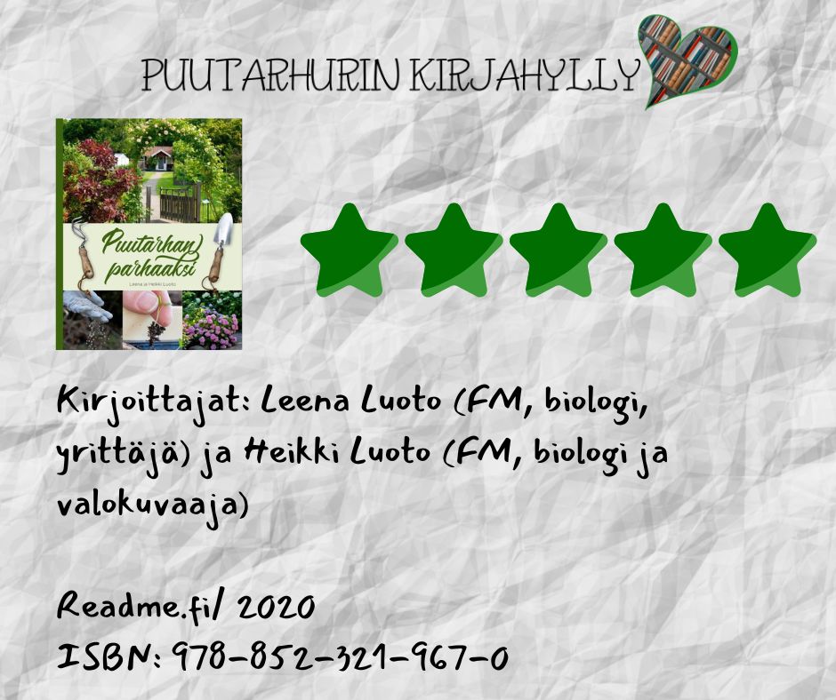 Puutarha-alalla toistuu usein samat kysymykset ja vastaukset vuodesta toiseen ja näistä ryhmän ylläpitäjät Leena ja Heikki Luoto ovat nyt kirjoittaneet mainion kirjan, Puutarhan parhaaksi.