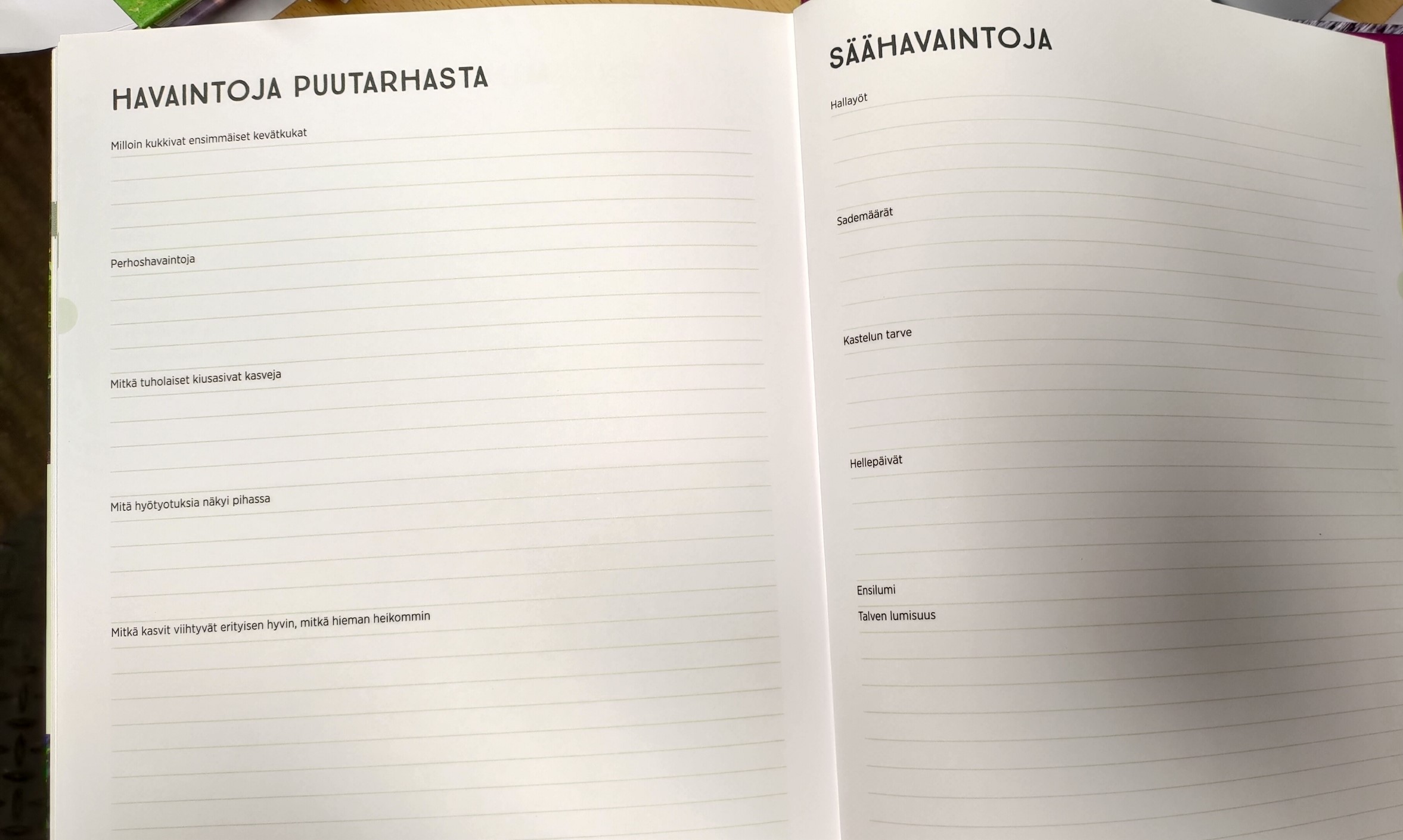 Kirjan lopussa onkin kivasti otsikoituna tilaa omille havainnoille, suunnitelmille ja piirroksille. Kun täydennät kirjaan tiedot juuri siitä omasta puutarhastasi, siitä tulee sinulle mahtava tietopankki juuri sen oman puutarhasi rakentamiseen ja hoitoon!