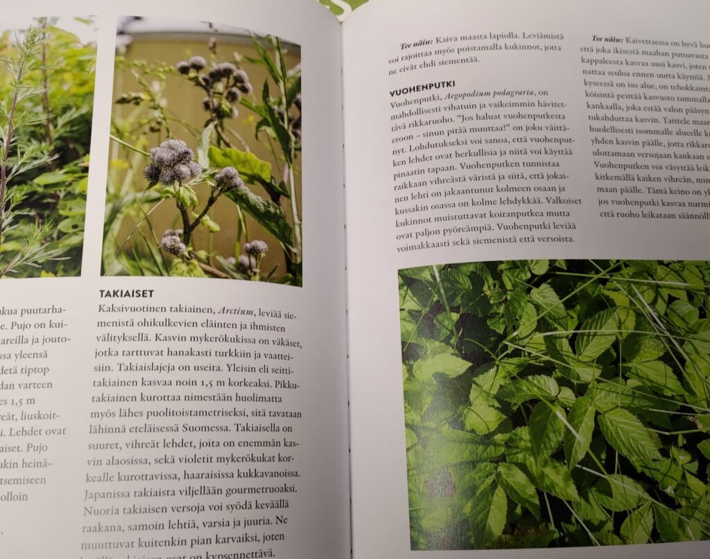 Kirjassa käydään myös rikkakasvit lajeittain läpi ja annetaan hyviä vinkkejä torjuntaan. Rikat on jaettu eri osioihin sen mukaan, onko kyseessä moni- vai yksivuotinen kasvi. Tämä on hyvä juttu. Rikoille kirjassa ei onneksi kehoteta mitään ruiskuttelemaan!