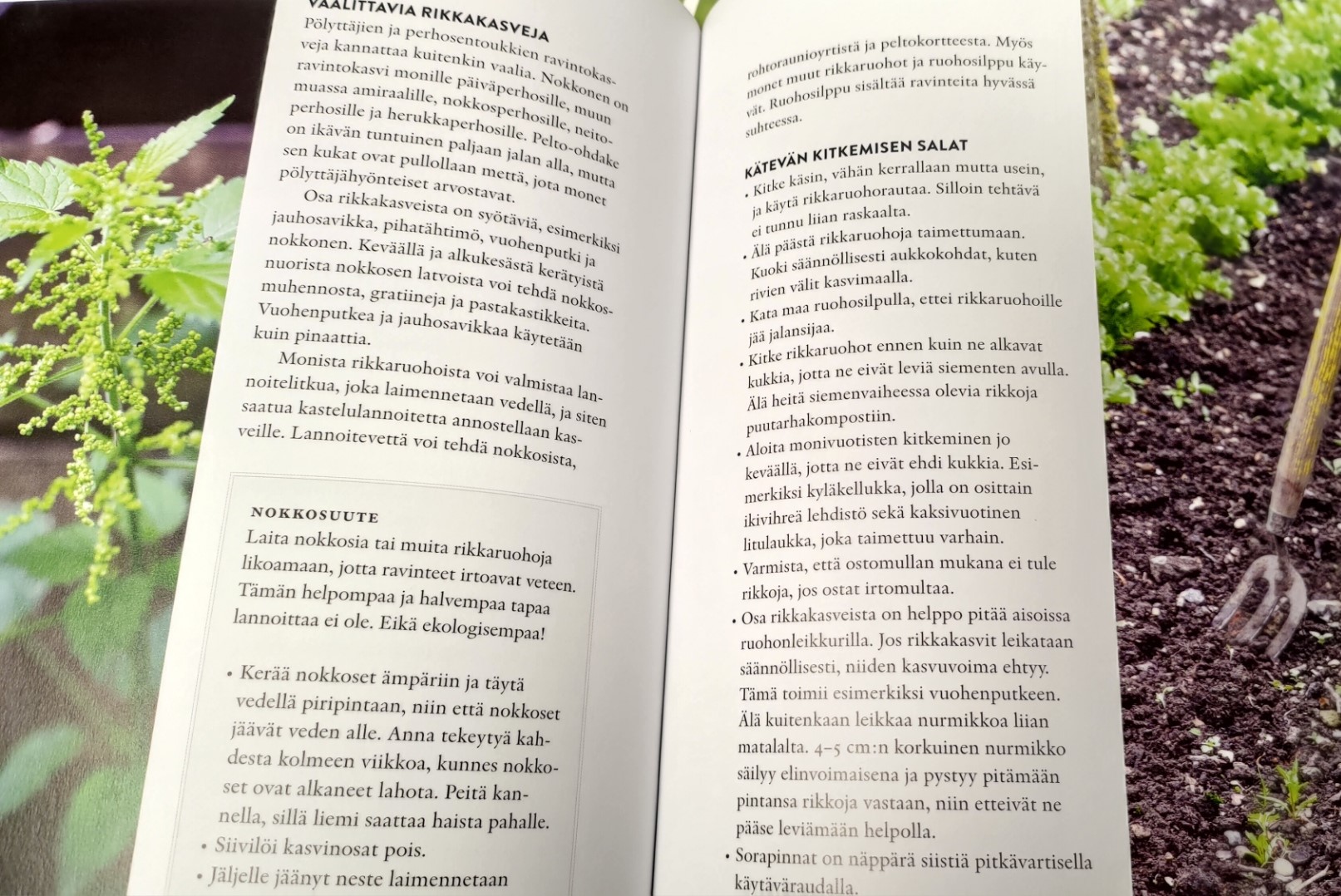 Kirjassa käydään myös rikkakasvit lajeittain läpi ja annetaan hyviä vinkkejä torjuntaan. Rikat on jaettu eri osioihin sen mukaan, onko kyseessä moni- vai yksivuotinen kasvi. Tämä on hyvä juttu. Rikoille kirjassa ei onneksi kehoteta mitään ruiskuttelemaan!